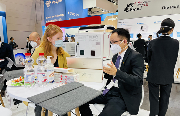 在经过同行推荐并使用了凯发K8产品后,一位从事检测工作十多年的苏丹客户专门找到凯发K8展台,进一步了解凯发K8新冠和其他试剂检测业务。看完凯发K8方案的操作后,他频频点头并表示,“你们的方案应用场景广、操作简便、精准可及,我非常看好你们!”